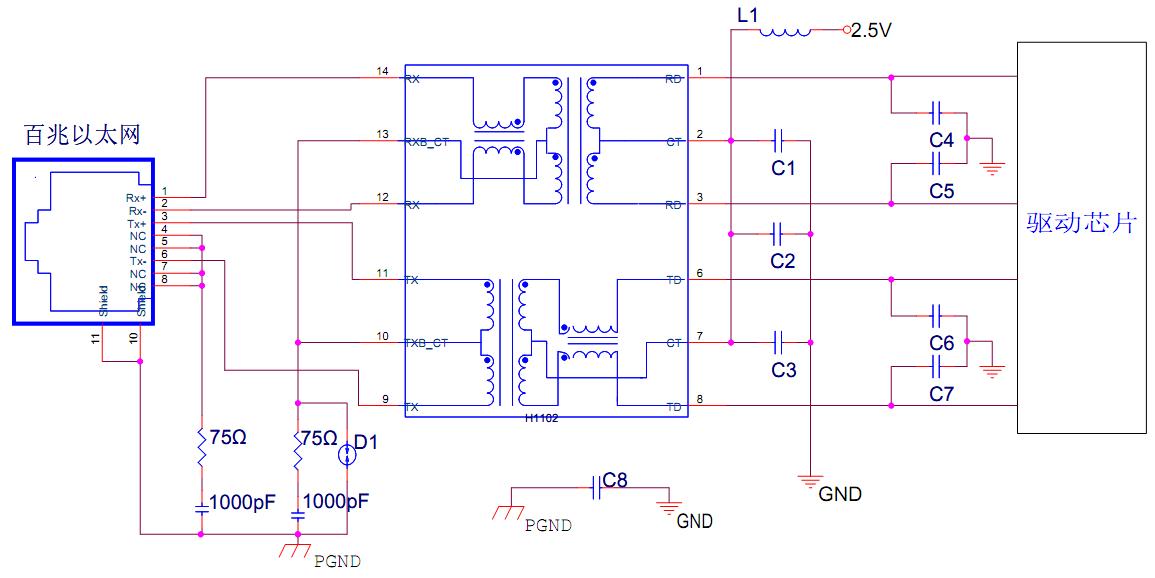 百兆以太網(wǎng)接口2KV防雷濾波設(shè)計(jì)