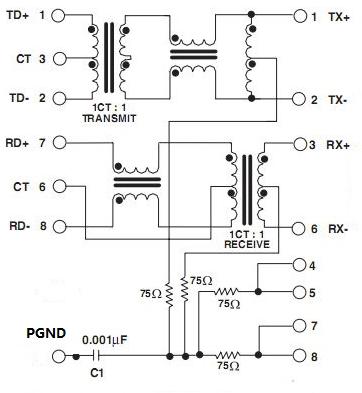 圖2 帶有共模抑制作用的網(wǎng)絡(luò)變壓器